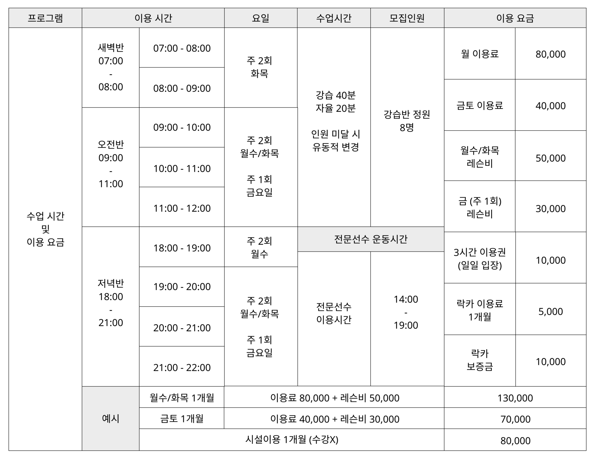 ※ 주 1회(금요일) 시설이용료는 금요일, 토요일 사용 가능합니다. (주 1회 직장인반(금요일)은 초급회원들에 한하여 운영 됩니다)